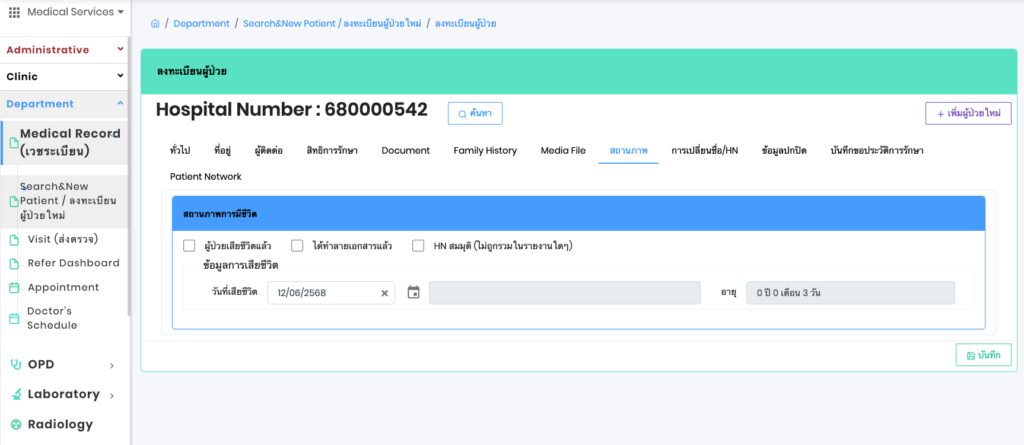 1. กดที่แท็บ สถานภาพ > กดเลือกผู้ป่วยเสียชีวิตแล้ว
