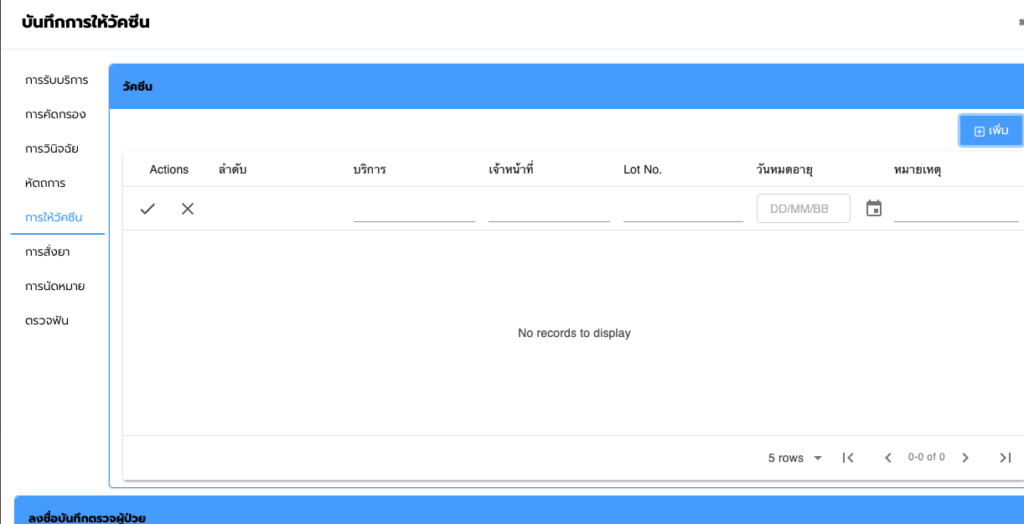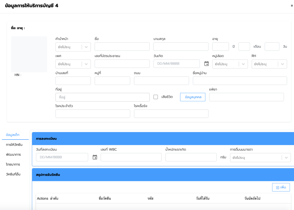 สามารถบันทึกข้อมูลการให้ Vaccine ได้โดยการคลิกที่แถบเมนู “การให้ Vaccine”จากนั้นคลิกที่ปุ่ม “เพิ่ม”