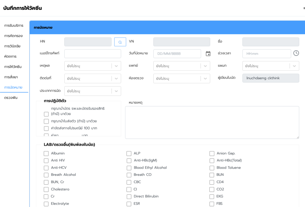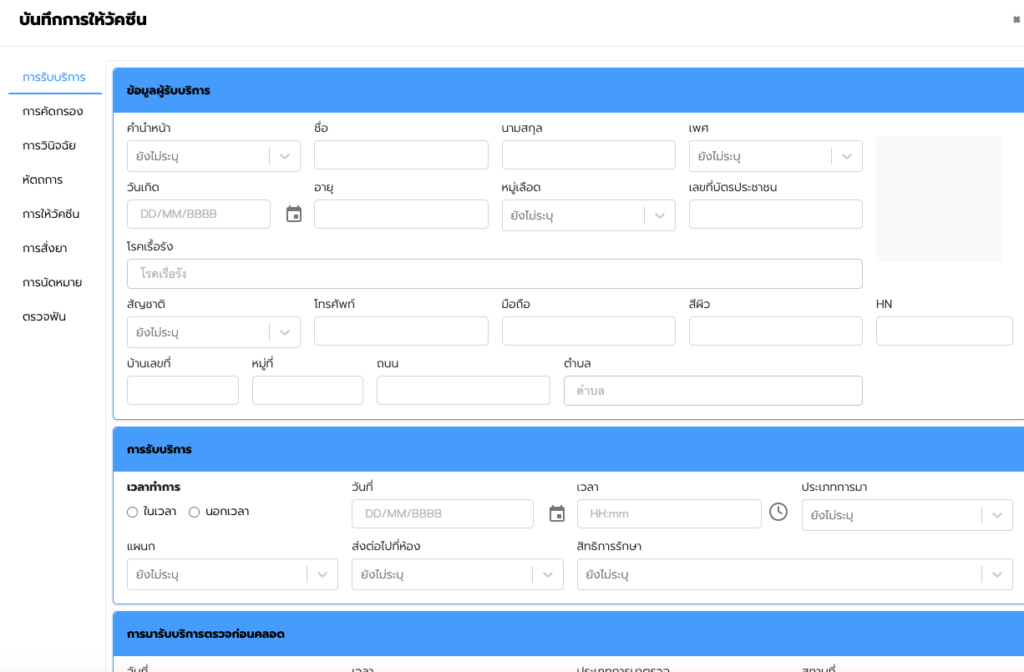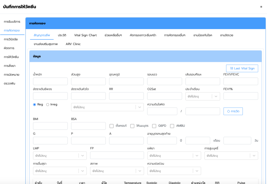 จากนั้นจะปรากฏหน้าจอบันทึกการให้ Vaccine ซึ่งจะมีแถบเมนูให้ลงรายละเอียดข้อมูลดังนี้