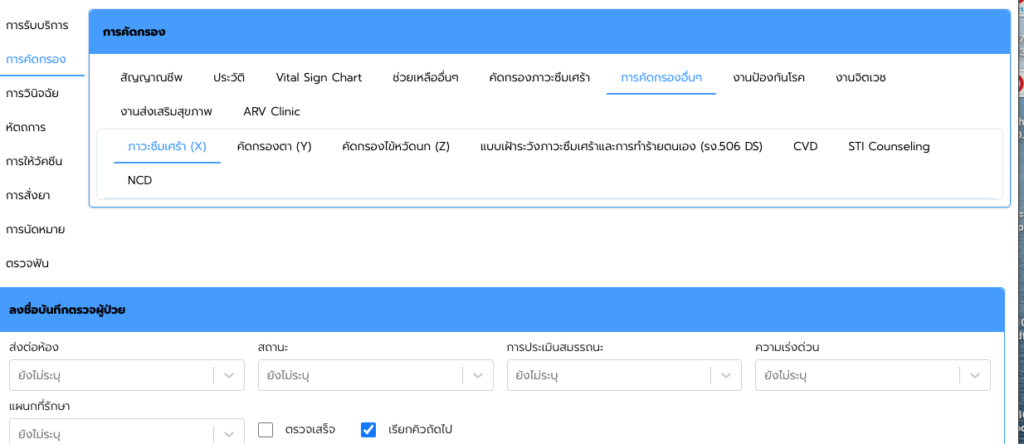 เป็นการบันทึกข้อมูลการคัดกรองภาวะซึมเศร้าให้กับผู้ป่วยบันทึกข้อมูลได้โดยคลิกที่ “การคัดกรองภาวะ