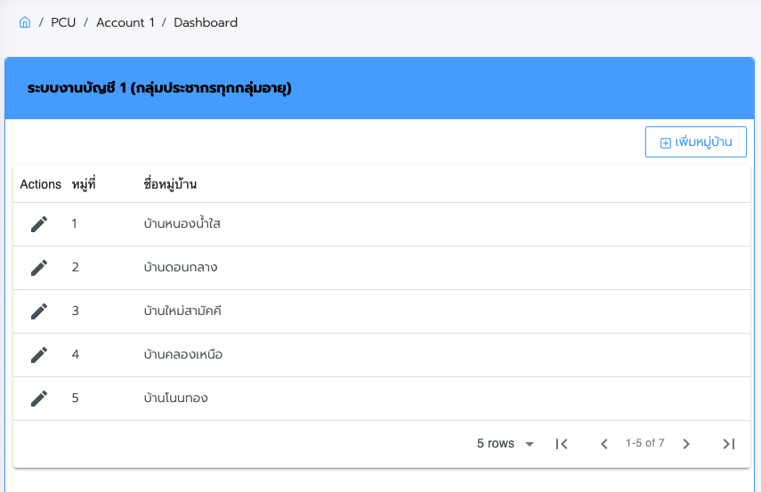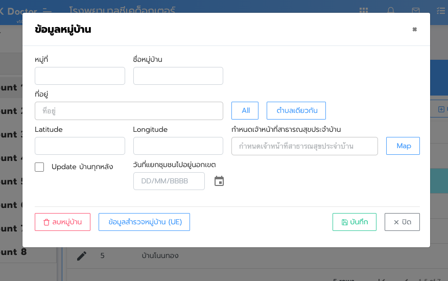 1.การเพิ่มหมู่บ้าน คลิกที่ปุ่ม เพิ่มหมู่บ้าน ทางด้านบนซ้าย เพื่อทำการเพิ่มหมู่บ้าน จะปรากฏหน้าข้อมูล