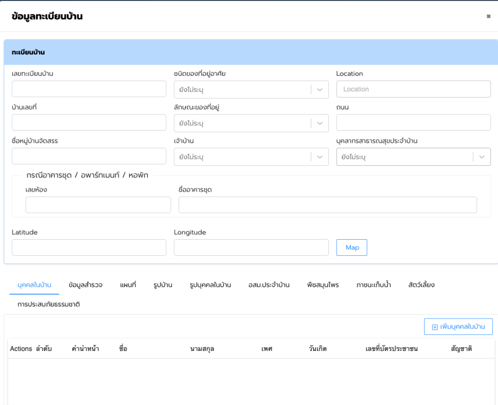 ข้อมูลทะเบียนบ้าน ในหน้าจอนี้ จะแบ่งข้อมูลเป็นสองส่วนหลักๆ ส่วนแรกช่องรายละเอียดทางด้านบนใส่บ้านเลขที่