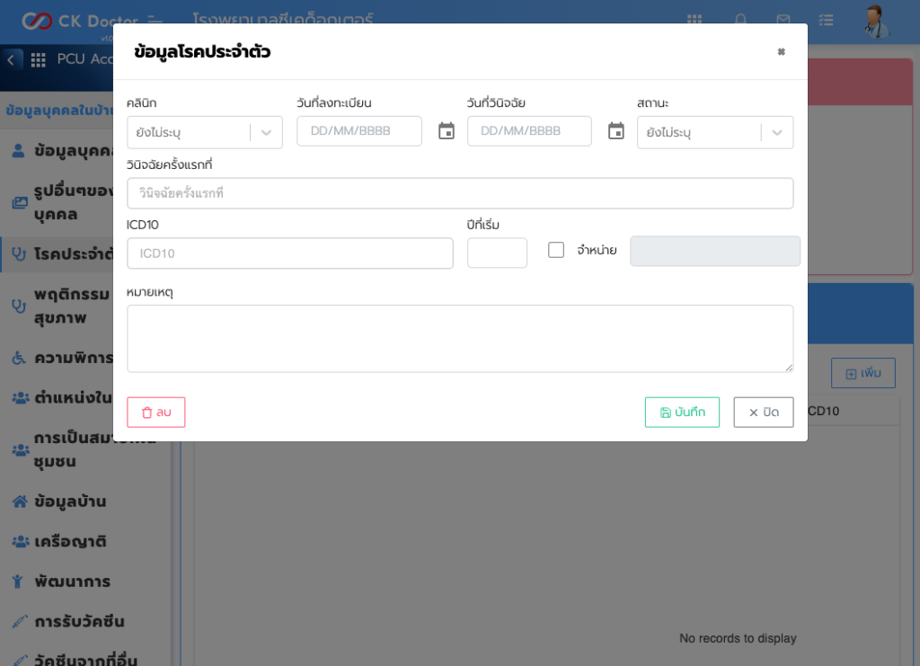 ของผู้ป่วย โดยคลิกที่ปุ่ม “เพิ่ม” ให้กรอกข้อมูลโรคประจำตัวของผู้ป่วย แล้วคลิกที่ปุ่ม “บันทึก”