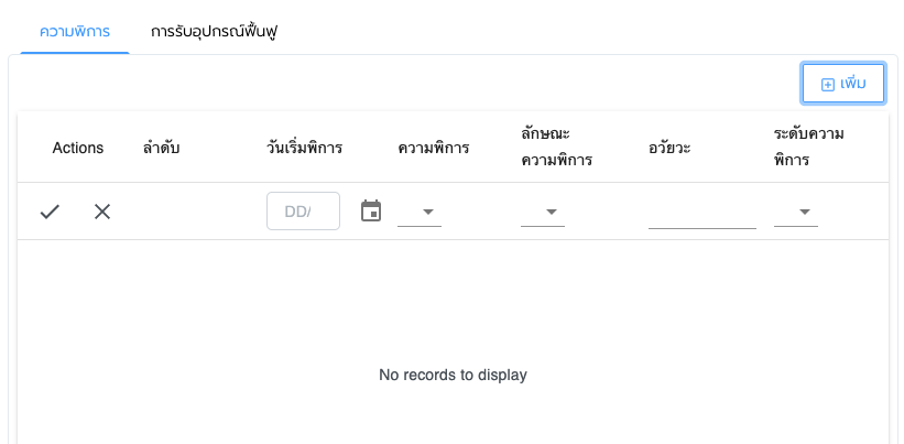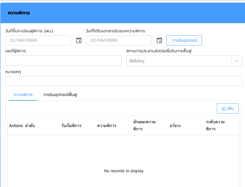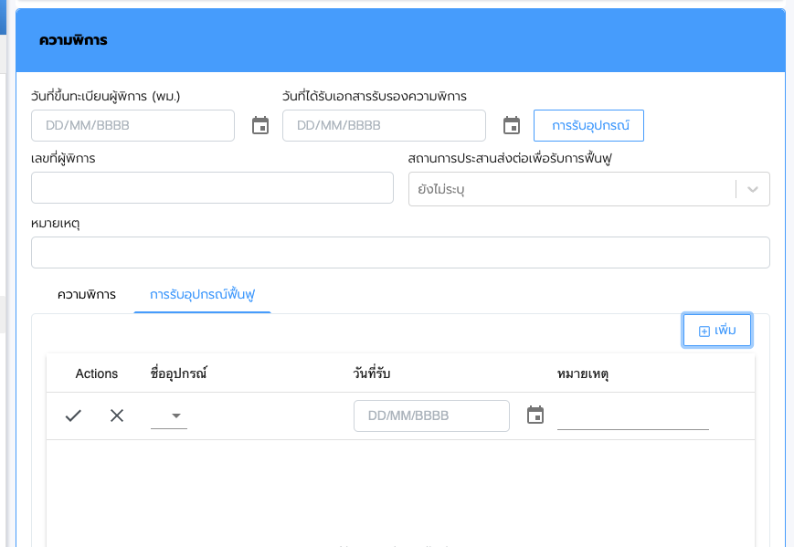ของข้อมูลผู้พิการ ในแถบความพิการและแสดงแถบการรับอุปกรณ์ฟื้นฟูขึ้นมาให้กรอกข้อมูลการรับอุปกรณ์ด้วย