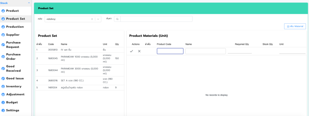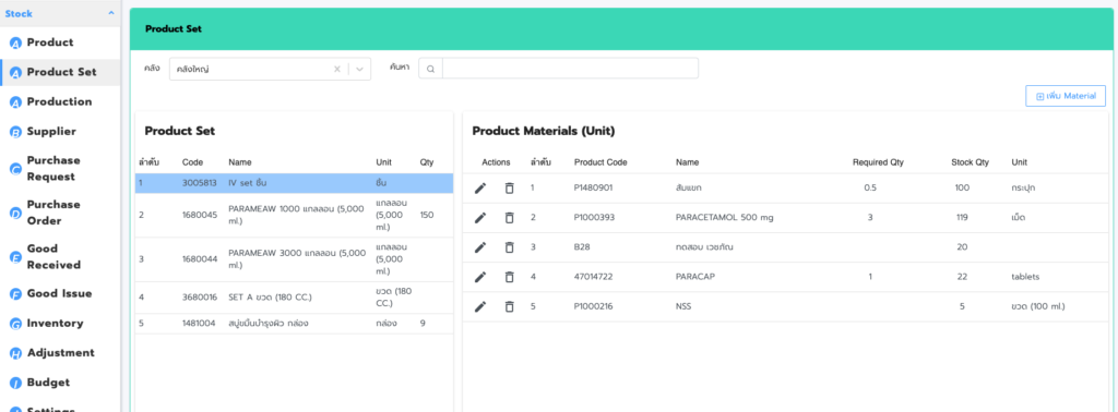 ก่อนดำเนินการตั้งค่า Product Set ควรกำหนดข้อมูลให้ครบถ้วนและชัดเจน ได้แก่ ชื่อ Product Set วัตถุประสงค์การใช้งาน รายการยาหรือวัสดุที่ต้องการรวม ปริมาณ วิธีใช้ และระยะเวลาใช้งาน จากนั้นทำการสร้างรายการใหม่และตั้งชื่อที่เมนู Product ให้เรียบร้อยกำหนด Materials ให้เข้าไปที่เมนู Product Set และเลือกที่ชื่อ Product set แล้วเพิ่ม Material เพื่อระบุส่วนผสมและจำนวนที่ใช้ให้ครบถ้วน ก่อนบันทึกและนำไปใช้งานในระบบ